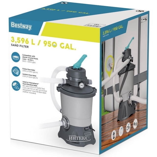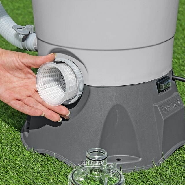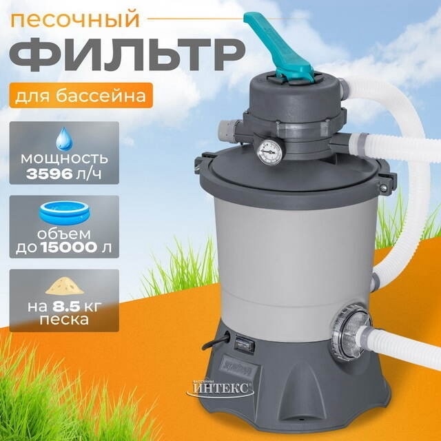 Песочный фильтр-насос Bestway (артикул: 58515 ) используется для механической очистки воды за счет циркуляции воды бассейна через фильтрующий компонент (стеклянный либо кварцевый песок), расположенный в установке. Подключается к штатным системам бассейна через шланги ввода/вывода. Вода поступает из бассейна по шлангу в фильтр-насос, проходит через песок, оставляя на нём загрязнения, и возвращается обратно в бассейн. Качество фильтрации песочного фильтра в полтора раза выше картриджного аналога. Песок необходимо менять каждые 2-5 лет.