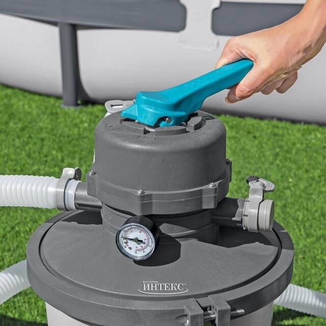 Bestway 58515 комплектуется 6-ти позиционным клапаном переключения режимов, есть обратная промывка и таймер, манометр для контроля давления.