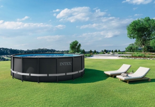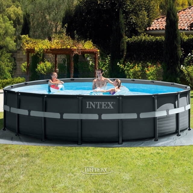 Сборный каркасный бассейн серии Intex Ultra Frame комплектации DELUXE с песочным фильтр-насосом, лестницей, тентом и подстилкой.