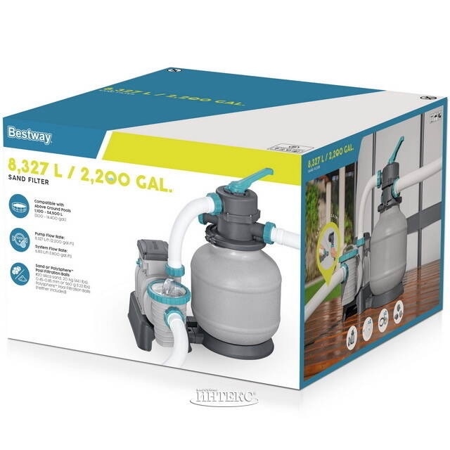 Песочный фильтр-насос Bestway (артикул: 58499 ) используется для механической очистки воды за счет циркуляции воды бассейна через фильтрующий компонент (стеклянный либо кварцевый песок), расположенный в установке. Подключается к штатным системам бассейна через шланги ввода/вывода. Вода поступает из бассейна по шлангу в фильтр-насос, проходит через песок, оставляя на нём загрязнения, и возвращается обратно в бассейн. Качество фильтрации песочного фильтра в полтора раза выше картриджного аналога. Песок необходимо менять каждые 2-5 лет.