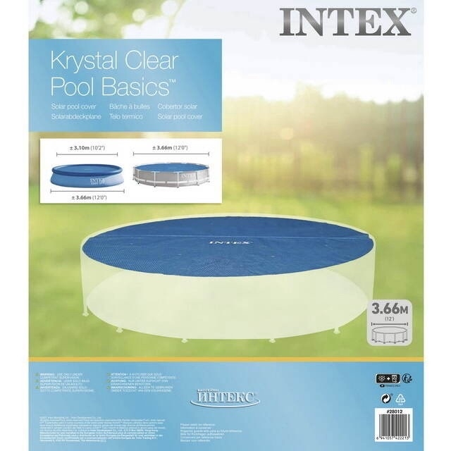Солнечное покрытие для бассейна диаметром 366 см помогает дольше сохранять тепло воды и защищает её от загрязнений. Пузырьковая ПВХ-плёнка эффективно аккумулирует солнечное тепло и препятствует испарению.