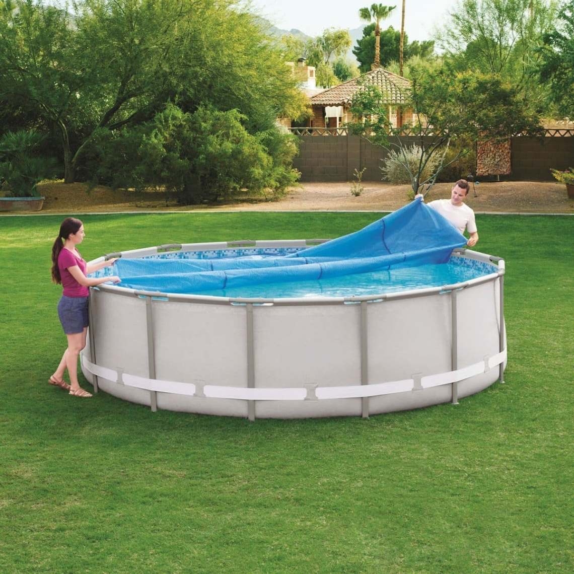 Просто разместите покрытие на поверхности воды пузырьками вниз - оно будет свободно плавать без креплений. Используйте в солнечную погоду для нагрева и в прохладную - для удержания температуры.