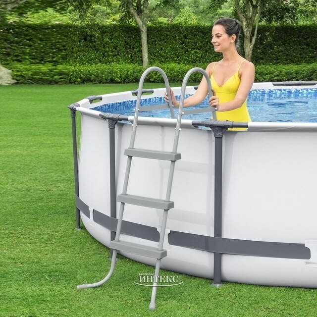 В комплект поставки входят фильтр-насос производительностью 2006 л/ч для очистки и циркуляции воды, картридж, шланги и хомуты, необходимые для подключения к бассейну и лестница.