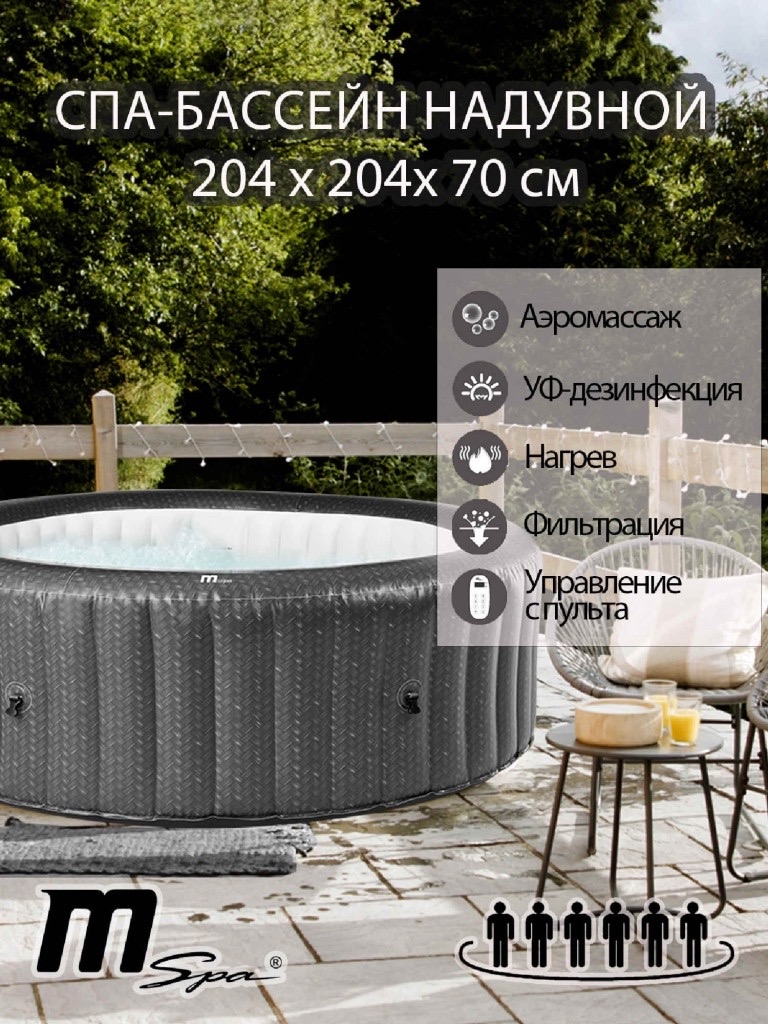MSPA COMFORT Ottoman Round Bubble Spa – отличный выбор для домашнего СПА-бассейна, подходит для использования как на открытом воздухе, так и в помещении. Вместимость до 6 человек. Корпус (чаша) бассейна из плотного прочного многослойного ПВХ с внутренним антибактериальным покрытием, дно с антискользящей защитой. Чаша обладает устойчивостью к проколам и разрывам. Дизайн стенок в современном роскошном стиле, наружная отделка под ротанг.