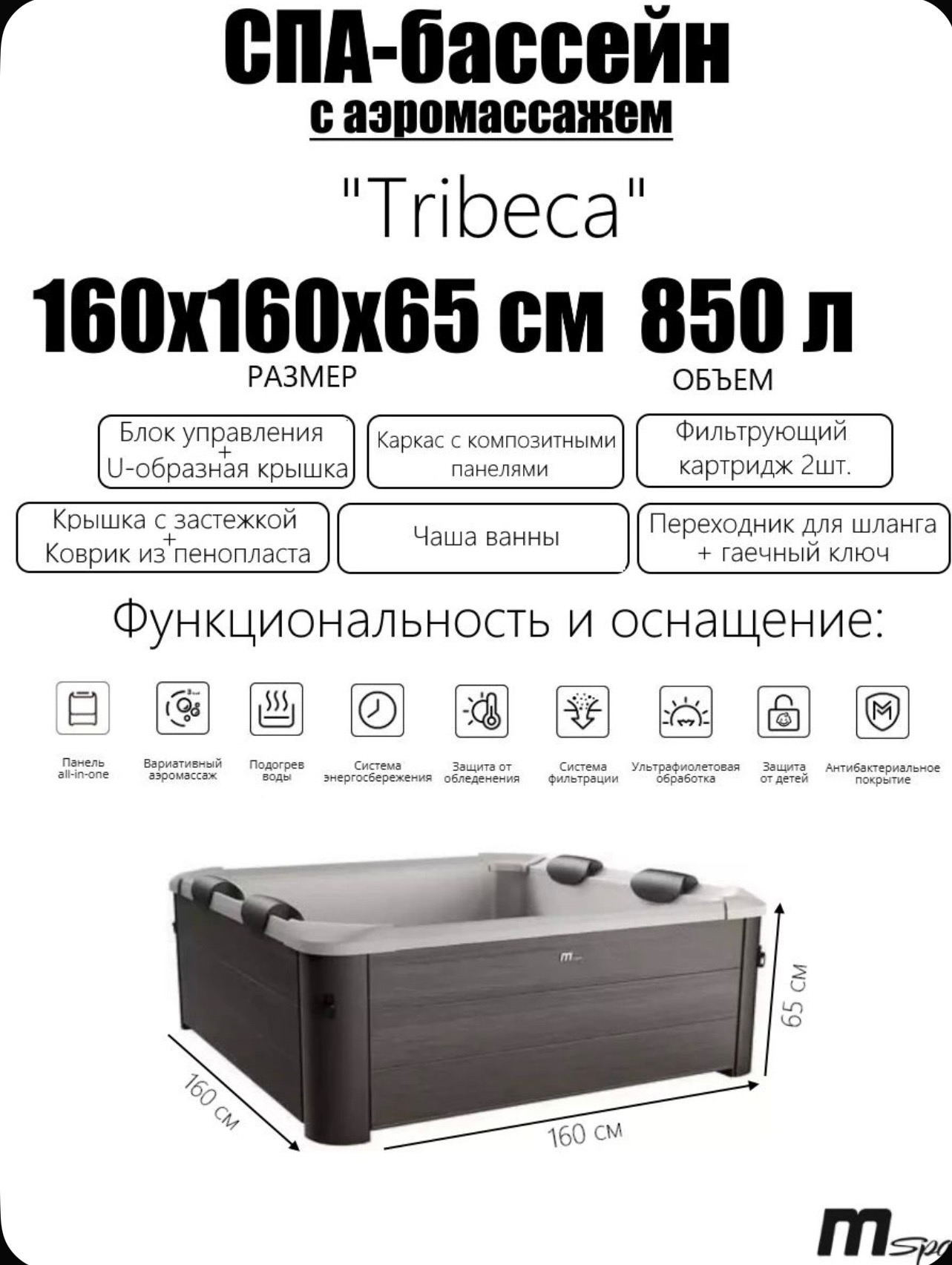 MSPA FrameTribeca Square Bubble Spa – отличный выбор для домашнего СПА-бассейна, подходит для использования как на открытом воздухе, так и в помещении. Вместимость до 6 человек. Корпус (чаша) бассейна из плотного прочного многослойного ПВХ с внутренним антибактериальным покрытием, дно с антискользящей защитой. Чаша обладает устойчивостью к проколам и разрывам.