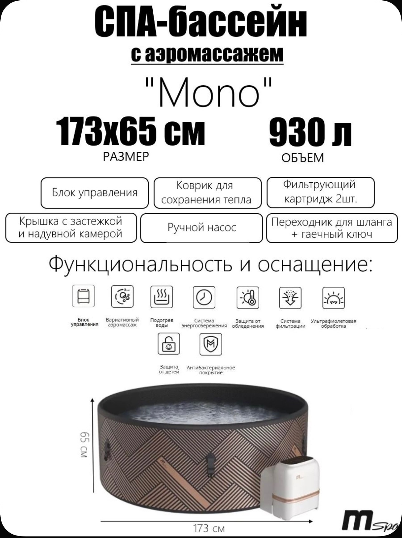 Размеры 173х65см, объем 930 л. СПА-бассейн предназначен для активного купания 6 человек, подходит для использования как в помещении, так и на открытом воздухе. Материал чаши изготовлен из высококачественного плотного многослойного ПВХ с антибактериальным покрытием. Внутренняя конструкция чаши надежная и безопасная, не деформируется и устойчива к разрыву. Стенки чаши выполнены по той же технологии, по которой производятся SUP-доски, за счет чего имеют небольшую толщину и при этом жесткие и устойчивые.