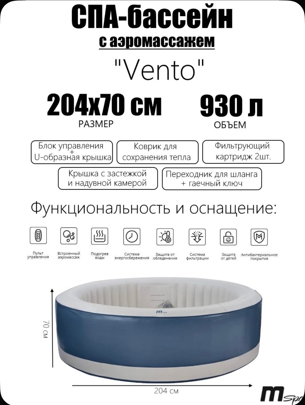 MSPA Premium Vento Round Bubble Spa – отличный выбор для домашнего СПА-бассейна, подходит для использования как на открытом воздухе, так и в помещении. Вместимость до 6 человек. Корпус (чаша) бассейна из плотного прочного многослойного ПВХ с внутренним антибактериальным покрытием, дно с антискользящей защитой. Чаша обладает устойчивостью к проколам и разрывам. Дизайн стенок в современном роскошном стиле.